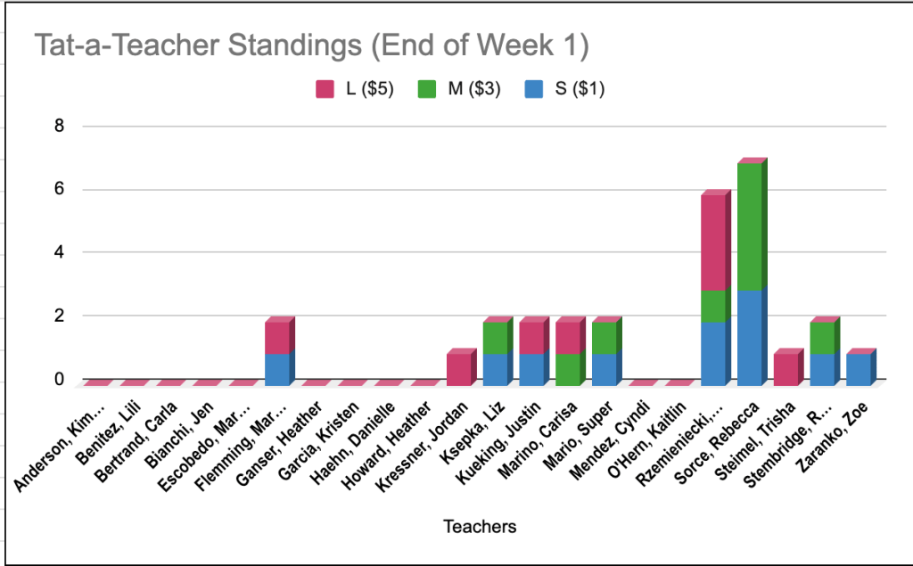 Here are our week 1 standing for tat-a-teacher!